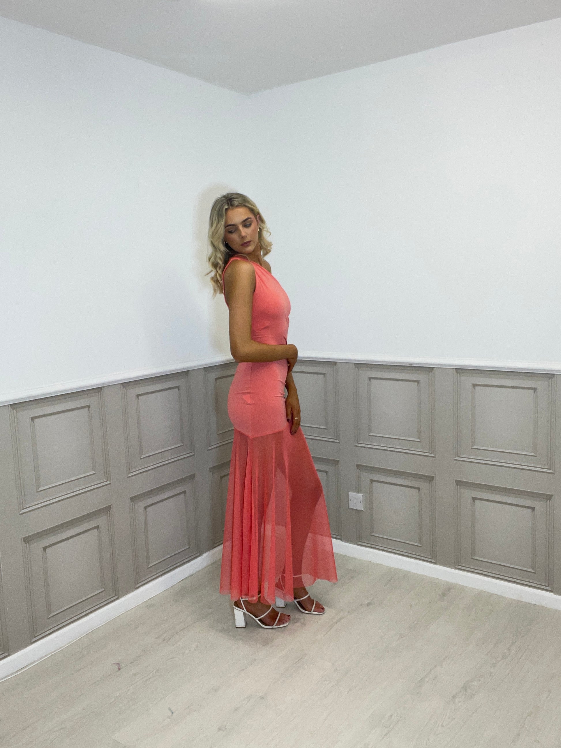 It’s unique chiffon fishtail effect enchances the figure hugging style of this beautiful piece.