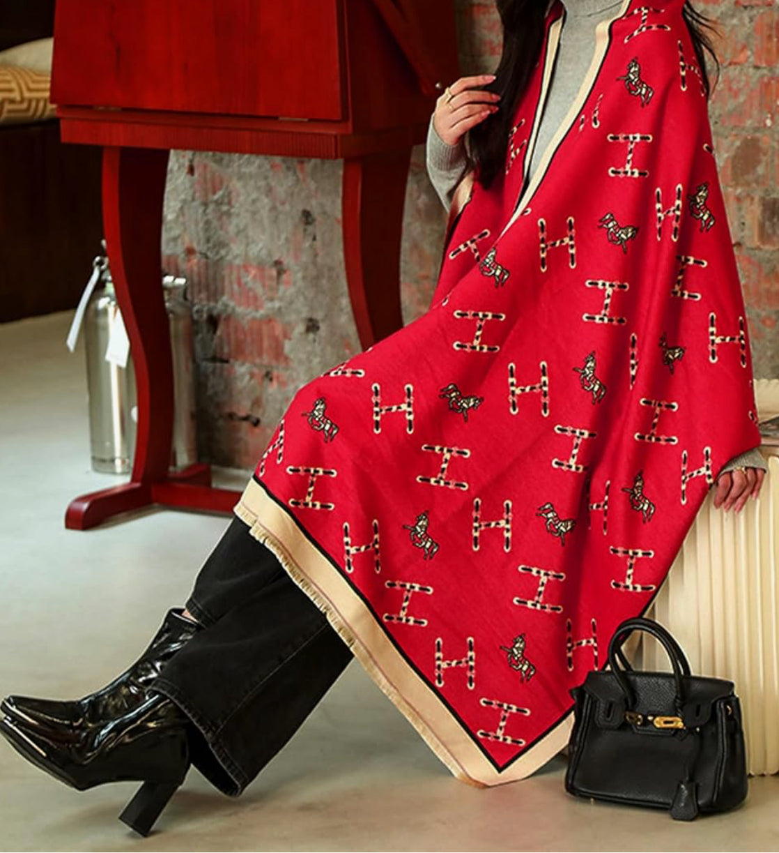 Turn heads with this striking red equestrian-inspired wrap — a bold, elegant piece that blends classic luxury with modern flair. The scarf features an all-over pattern of interlocking “H” motifs, accented by miniature horse and rider figures, giving it that timeless, high-end heritage look.