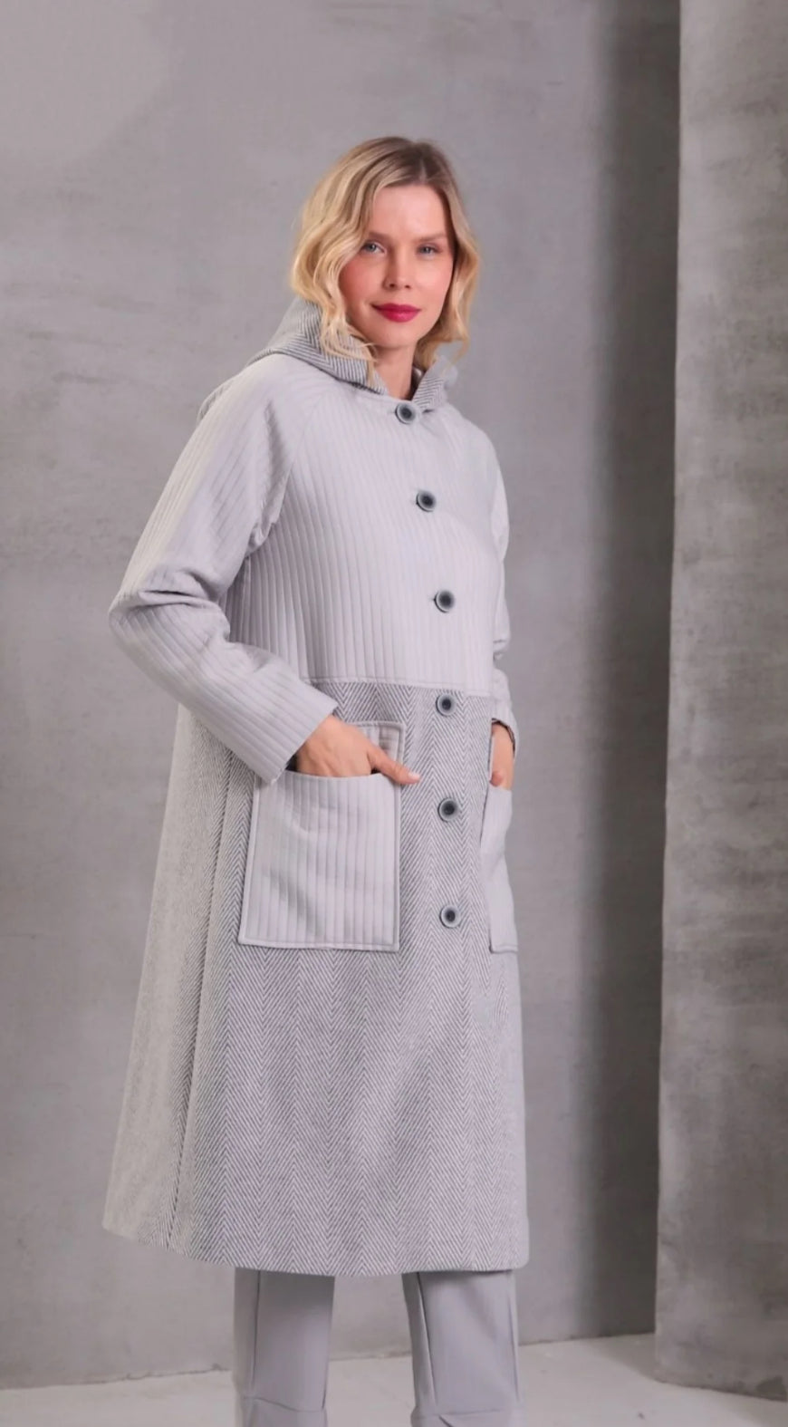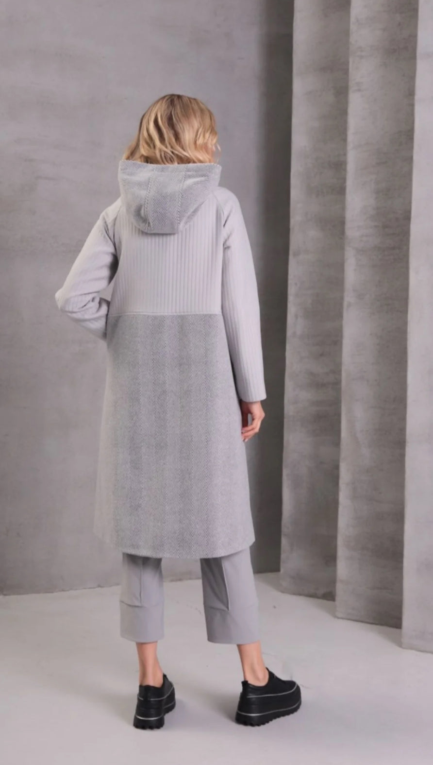 This elegant light-grey coat combines modern sophistication with timeless style. Designed with a mix of textures, the upper section features a subtle ribbed pattern, while the lower part showcases a refined herringbone weave. The coat is accented with oversized buttons down the front and two large patch pockets that add both practicality and charm. Its structured silhouette, long length, and hooded collar create a versatile outerwear piece perfect for cooler seasons. Paired with tailored trousers, it offers a chic, minimalist look suitable for both casual and formal settings.