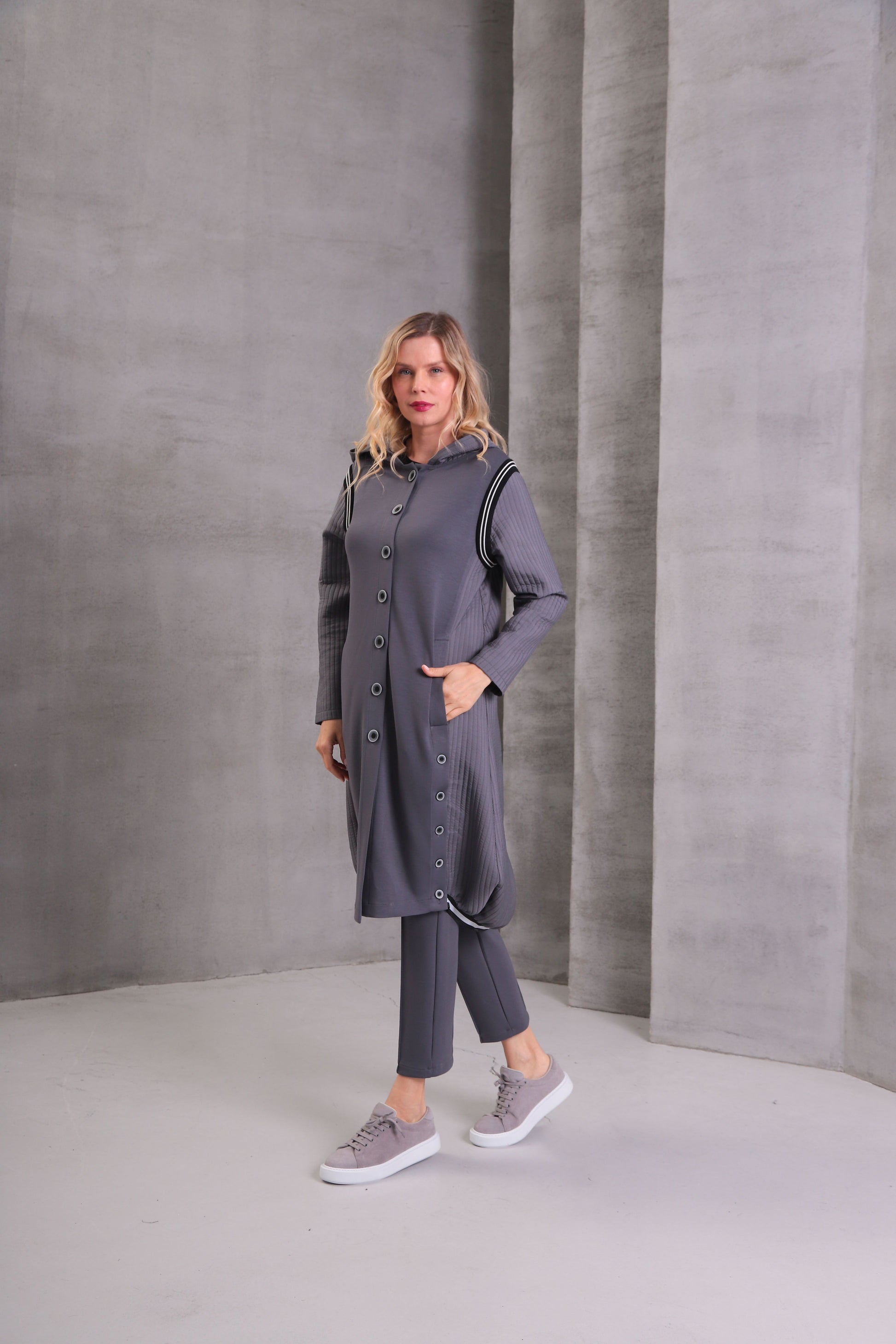This coat is a statement in minimalist sophistication. Crafted in a soft grey tone, it features a long, gently sculpted silhouette that narrows at the hem for a cocoon-like shape. The front is detailed with a line of oversized buttons, giving it an architectural edge, while the subtle texture along the sleeves and sides adds depth without distraction. The broad collar and hood lend a modern, almost futuristic vibe, and the pockets keep it practical. Paired with slim trousers and sneakers, it balances comfort, elegance, and quiet authority—an ideal piece for someone who moves through the world with purpose and understatement.