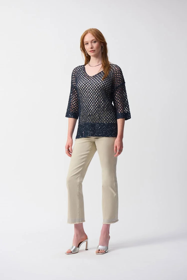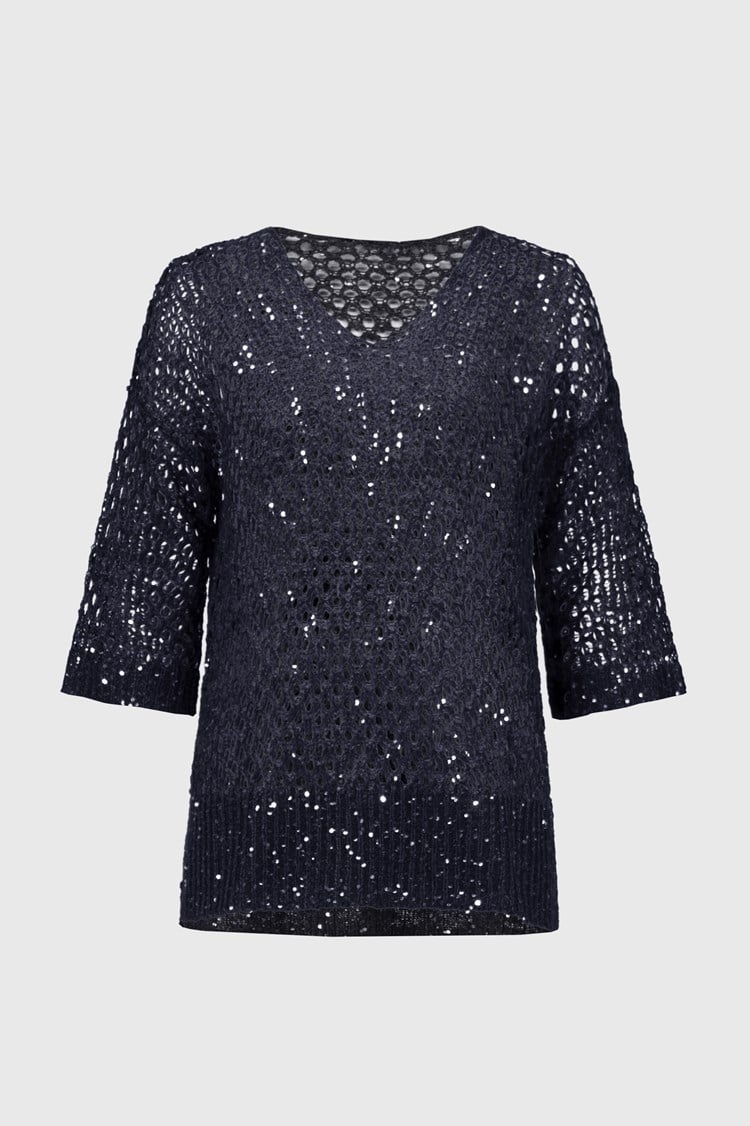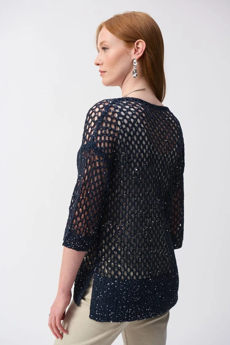 Add a touch of sparkle to your wardrobe with this acrylic blend knit sweater featuringino sequins and an open stitch look.