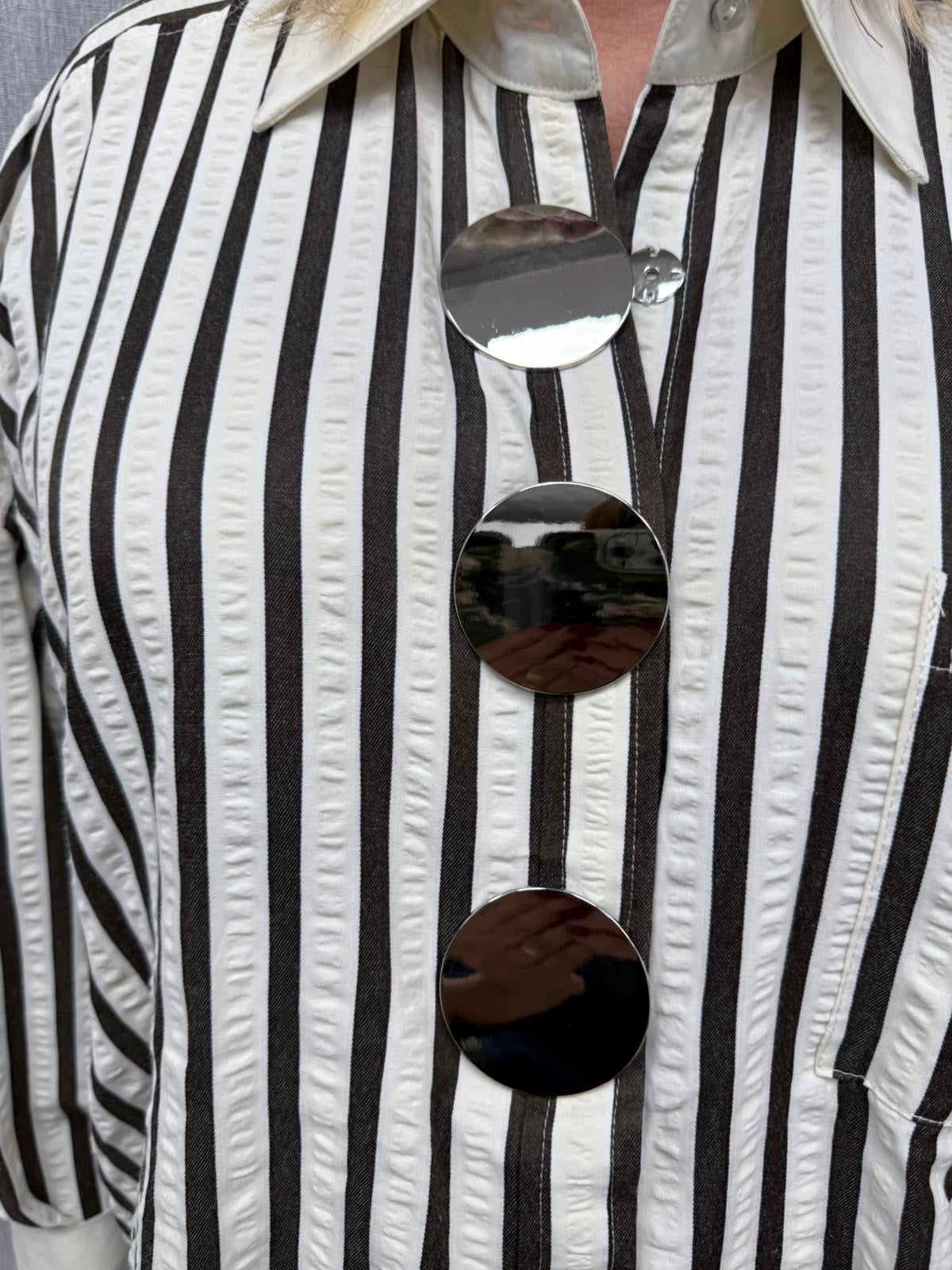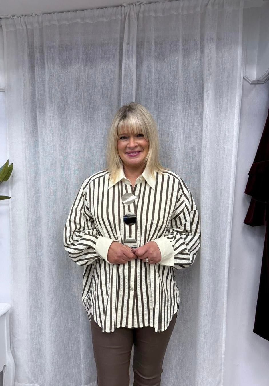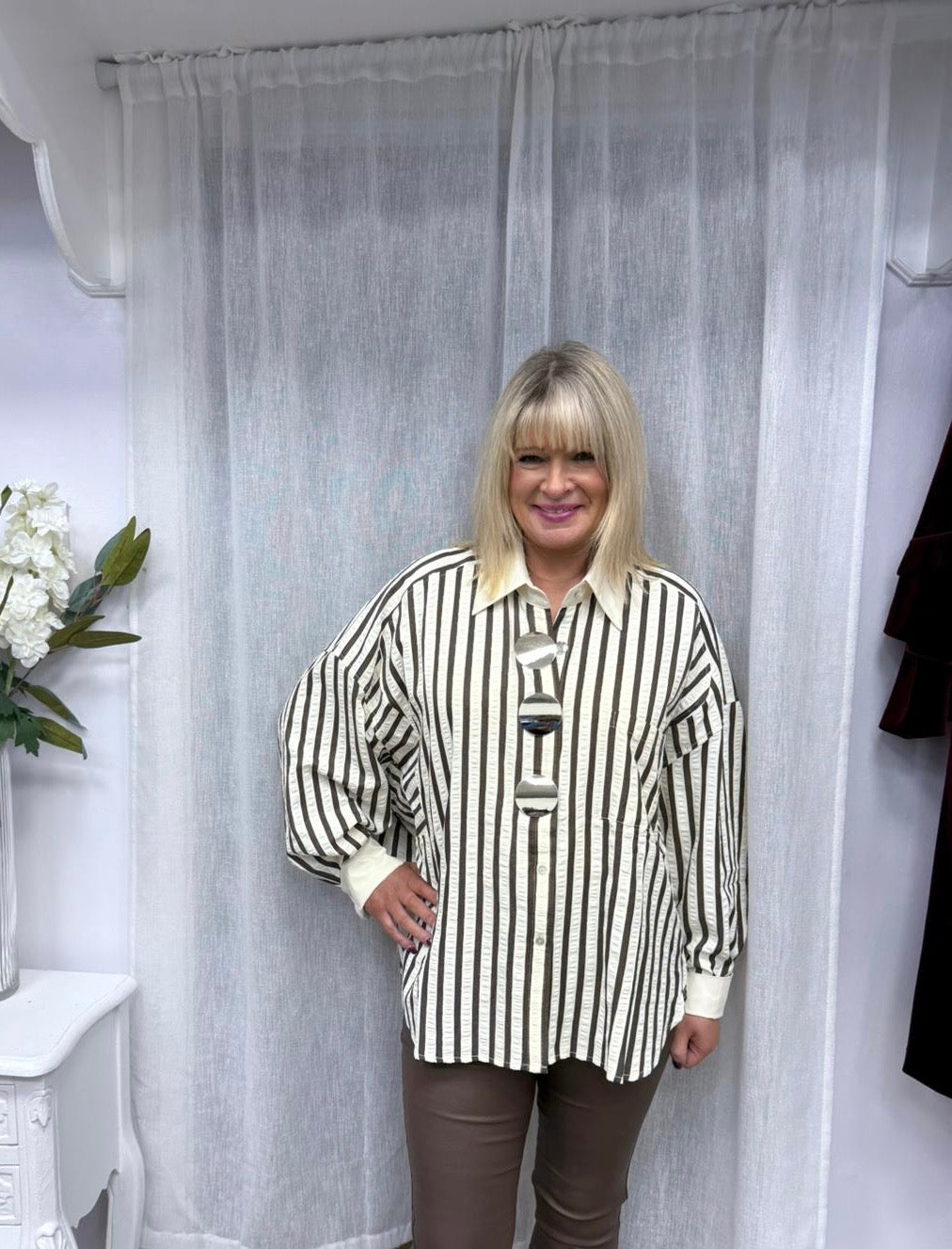 The top in the image is an oversized, button-down shirt featuring bold vertical stripes in cream and dark olive. It has a relaxed, contemporary silhouette with dropped shoulders and voluminous sleeves gathered at the cuffs for a slightly structured look. The collar and cuffs are solid cream, adding contrast and polish to the design. The shirt is accessorized with large statement pendants that bring a modern, artistic edge. It’s a versatile piece that combines effortless comfort with standout style.