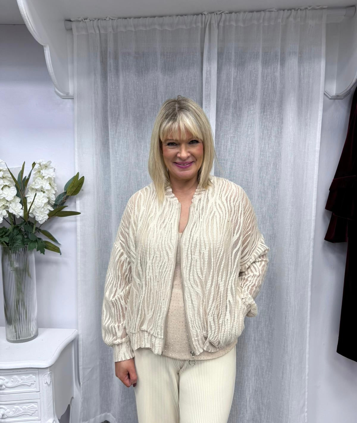 The jacket in the image is a lightweight, semi-sheer bomber-style piece in a soft cream shade. It features a subtle textured pattern with a wavy, metallic thread design that catches the light beautifully. The cuffs, collar, and hem are ribbed for a clean, structured finish, while the overall fit remains relaxed and elegant. It’s a versatile layering piece that adds a touch of shimmer and sophistication, perfect for both casual and dressy looks.