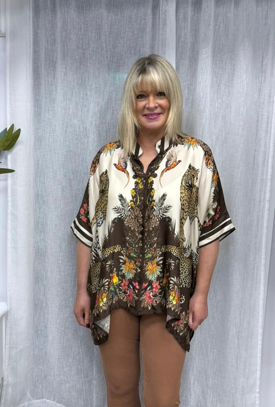 The jacket in the image is a loose, flowy kimono-style top made from a silky, lightweight fabric. It features a bold, intricate print with earthy tones—mainly browns, creams, and hints of orange, green, and yellow. The design includes leopards, tropical foliage, and birds, giving it an exotic, nature-inspired vibe. The sleeves are wide and relaxed, the hemline is asymmetrical (longer at the sides), and there’s a dark brown border detail running along the neckline and down the front. It’s a statement piece—dramatic but comfortable.