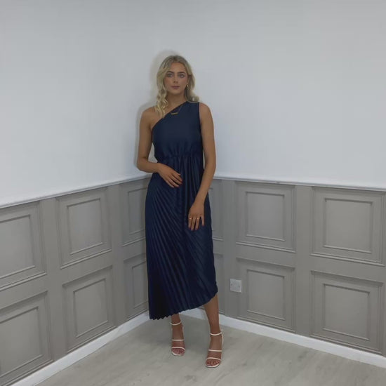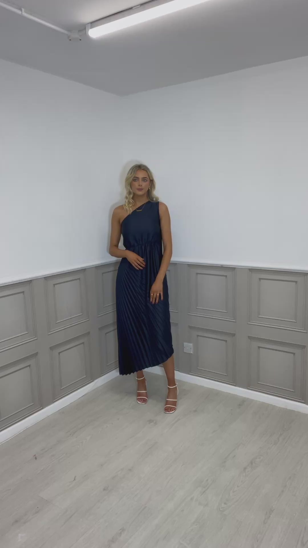 A stylish one shoulder dress with a fine soft pleat ,midi length with a long scarf detailing at the back.