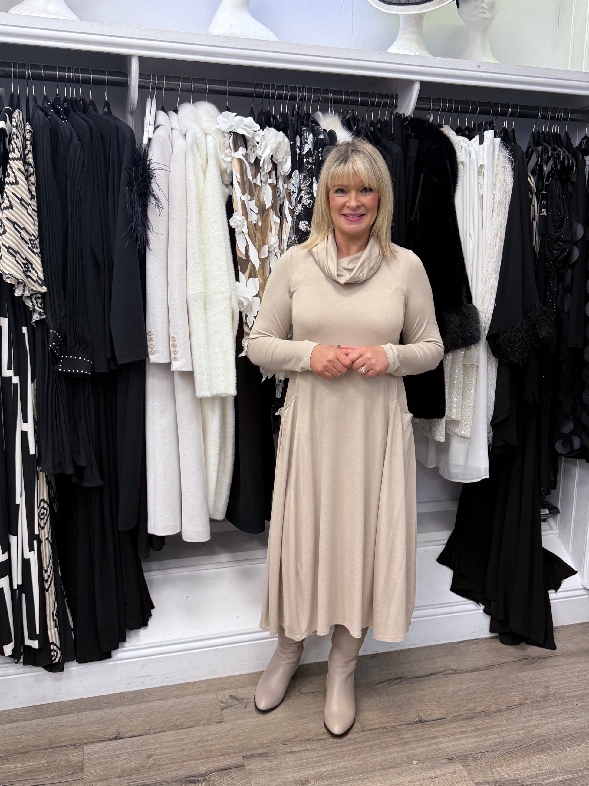 Effortless style meets everyday comfort with this chic Noen cowl neck dress. Designed in a flattering A-line silhouette, it skims beautifully over the body while offering freedom of movement. The soft draped cowl neckline adds a touch of elegance, while the side pockets make it both practical and stylish.