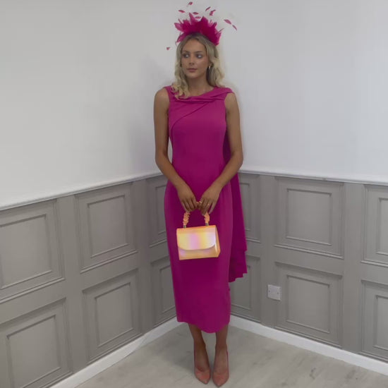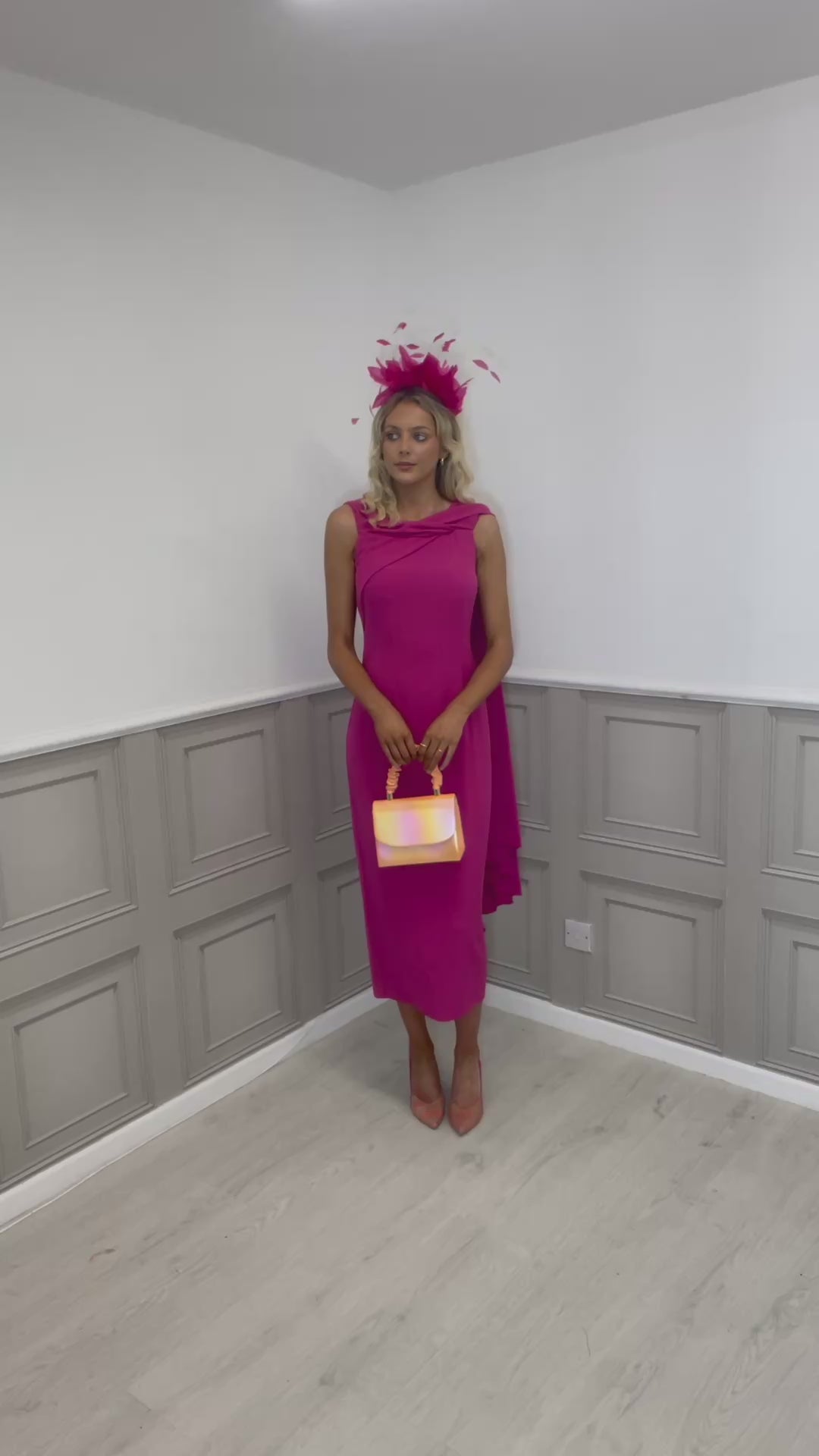 Stunning dress in a vibrant fuchsia pink dress. The dress is off-shoulder with an asymmetrical neckline and a form-fitting silhouette that falls to mid-calf length. The back of the dress features a layered ruffle detail that adds dimension and flair.