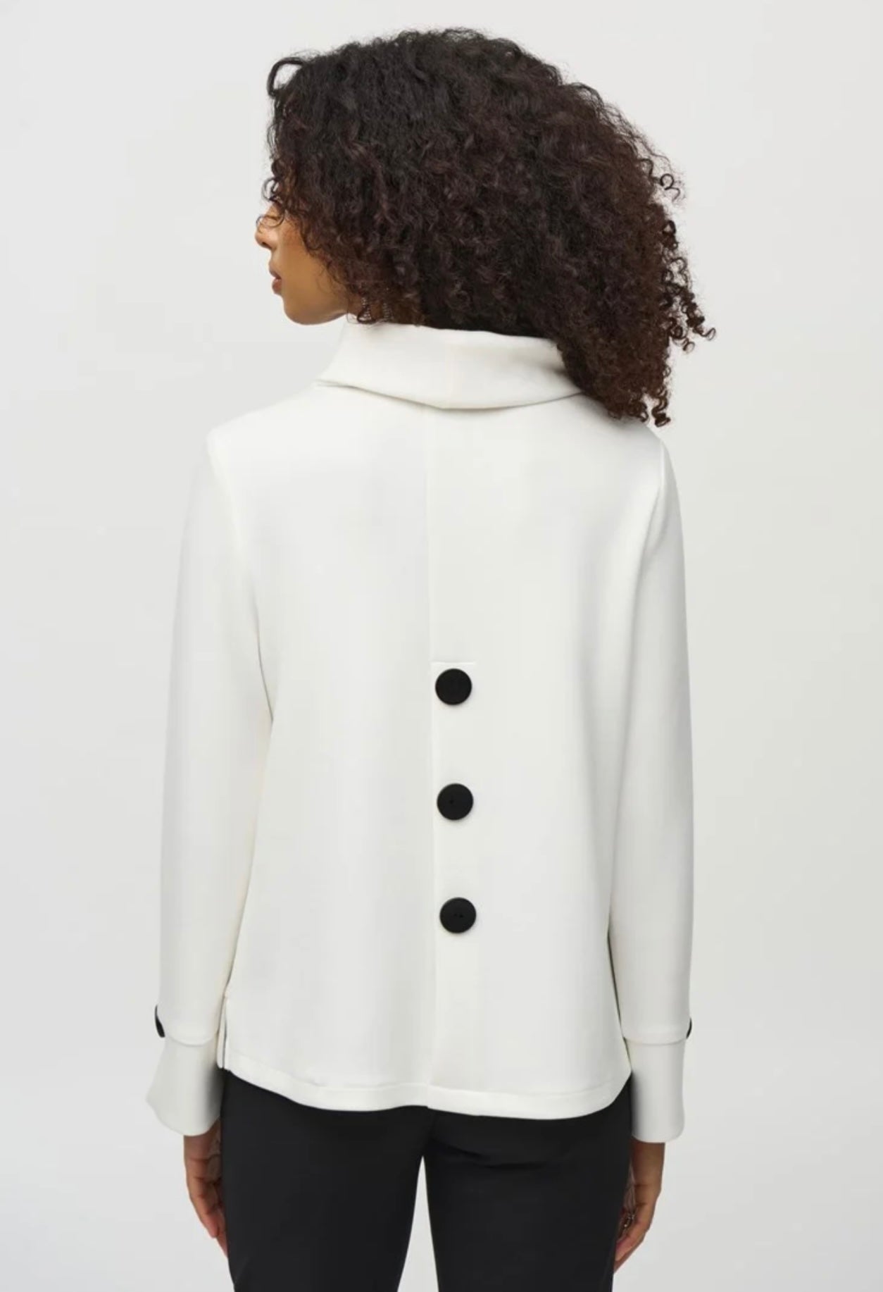 Embrace effortless style in this scuba jersey top. This contemporary piece is designed in a bold boxy silhouette with a sleek cowl collar and long sleeves with subtle slits at the cuffs for extra flair. The long slit at the back of the garment and contrasting buttons lend the top its unique appeal.