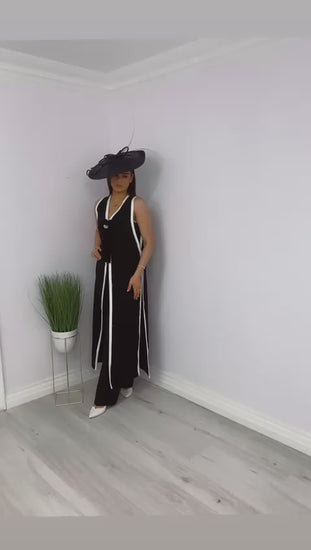 Stunning two-piece longline tunic and high waisted trousers two piece in a luxurious crepe fabric trimmed in black.